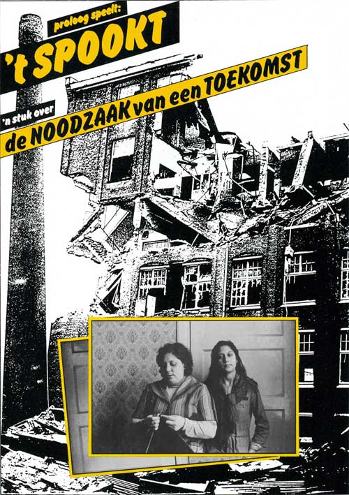 | 't Spookt. | Over de noodzaak van een toekomst(ondertitel). Toneelstuk voor vakbondsgroepen, waarin absurd realisme en spookachtig surrealisme elkaar doordringen. Gemaakt door een Proloog-collectief op basis van de ware gebeurtenissen rond een gesloten bedrijf. Waarin twee zwangere vrouwen verplicht zijn tot het uitzitten van een werkloos dienstverband. Op de achtergrond onstaan uit de loze muren de schimmen van de afbraak van de kapitalische economie en het te zwakke verzet van de vakbond.